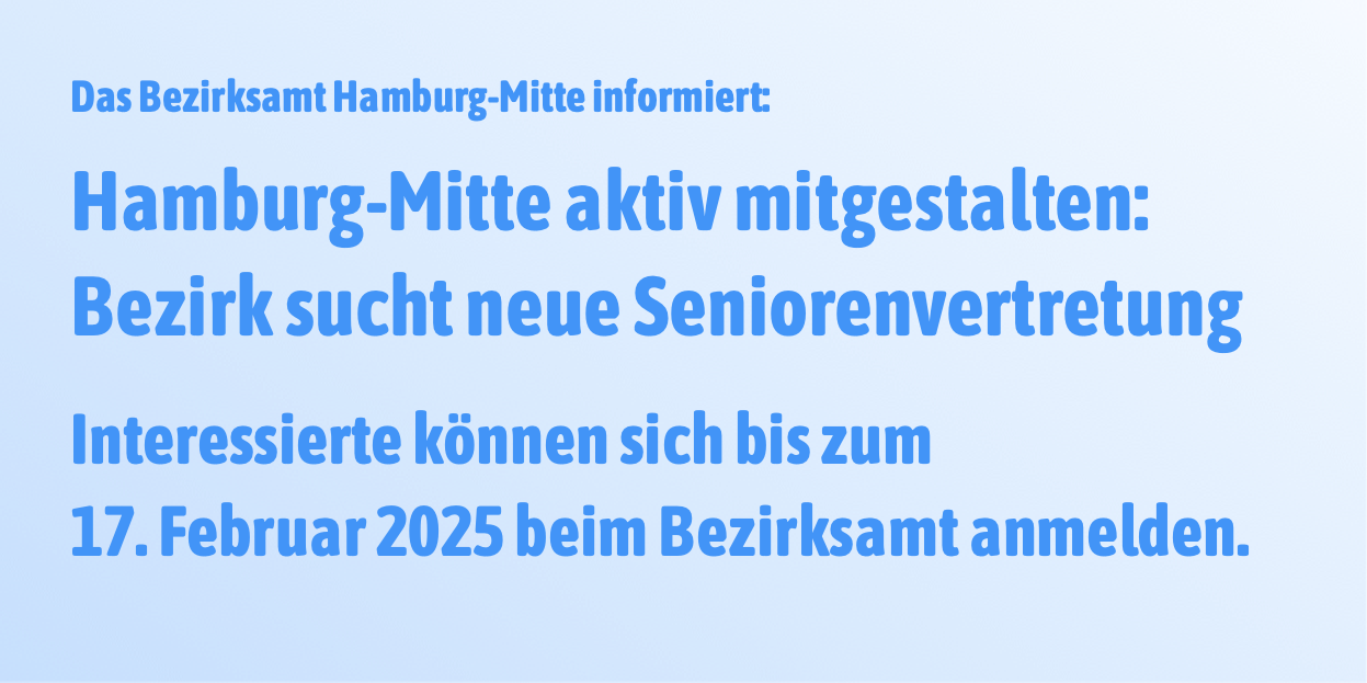 Im April 2025 konstituiert sich die neue Seniorendelegiertenversammlung (SDV) des Bezirks Hamburg-Mitte. Die Delegierten bestimmen anschließend den Bezirks-Seniorenbeirat (BSB). Diese Wahl bietet allen Hamburgerinnen und Hamburgern ab 60 Jahren die Möglichkeit, den Bezirk Hamburg-Mitte aktiv zu gestalten und die Belange der älteren Generation gegenüber Politik, Verwaltung und Öffentlichkeit zu vertreten. Interessierte können sich bis zum 17. Februar 2025 beim Bezirksamt Hamburg-Mitte anmelden.