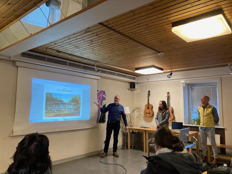 Das neue Haus ist als Pavillon im Park geplant und wird keine erkennbaren Rückseiten haben. Von allen Seiten wird man die offene Bauweise aus Holz mit großen Glasfronten und Stahlgeländern sehen und rundum sollen Bänke verlaufen, die unter den weit überstehenden Dächern zum Verweilen einladen. Das Erdgeschoss besteht aus zwei Teilen mit separaten Eingängen für den Senioren- und den Jugendbereich, während das Obergeschoss je nach Bedarf von allen genutzt werden kann. Alle Eingänge und Wege im Haus sind barrierefrei und natürlich wird es auch einen Fahrstuhl geben.