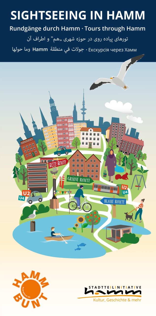 die zweite Auflage der liebevoll mit Karten, Fotos und Adressen gestalteten Broschüre „Sightseeing in Hamm" ist da! Auf 40 Seiten finden Sie drei ganz unterschiedliche Rundgänge durch unseren Stadtteil, die zum Entdecken einladen. Von Hamms grünen Oasen über Kultur bis hin zur Geschichte samt Geheimtipps kann viel betrachtet und entdeckt werden. Es ist bestimmt für alle etwas dabei! Die Broschüre ist in fünf verschiedenen Sprachen verfasst: Deutsch, Englisch, Arabisch, Persisch und Ukrainisch und liegt im Kulturladen Hamm, in der Buchhandlung Seitenweise ebenso sowie in vielen anderen Vereinen und Organisationen im Stadtteil aus.