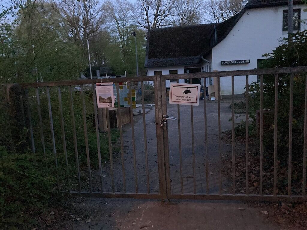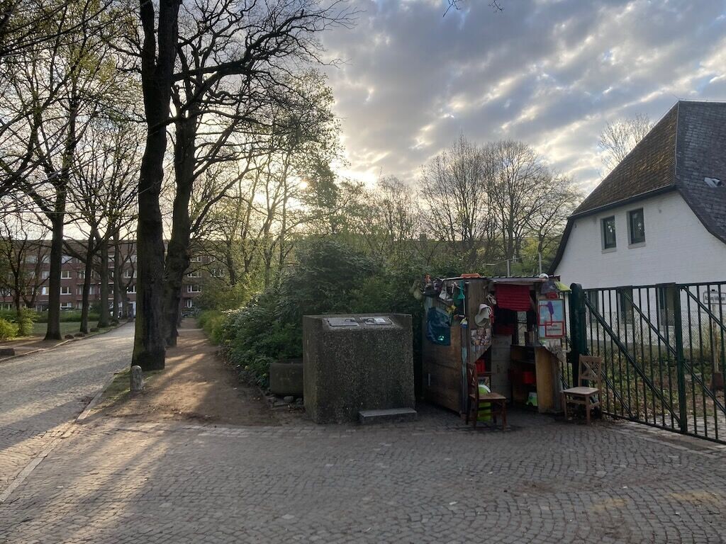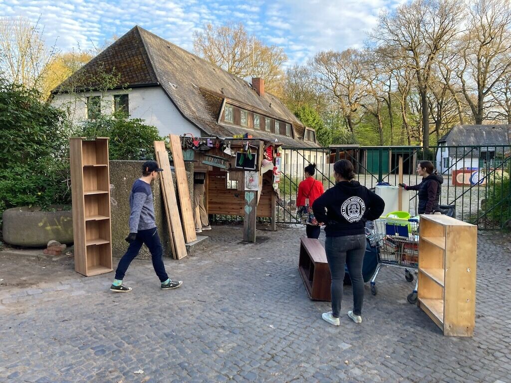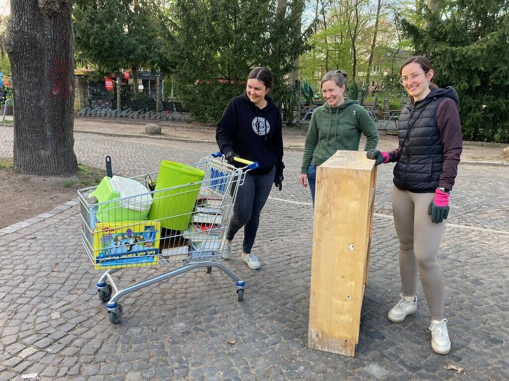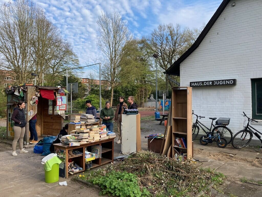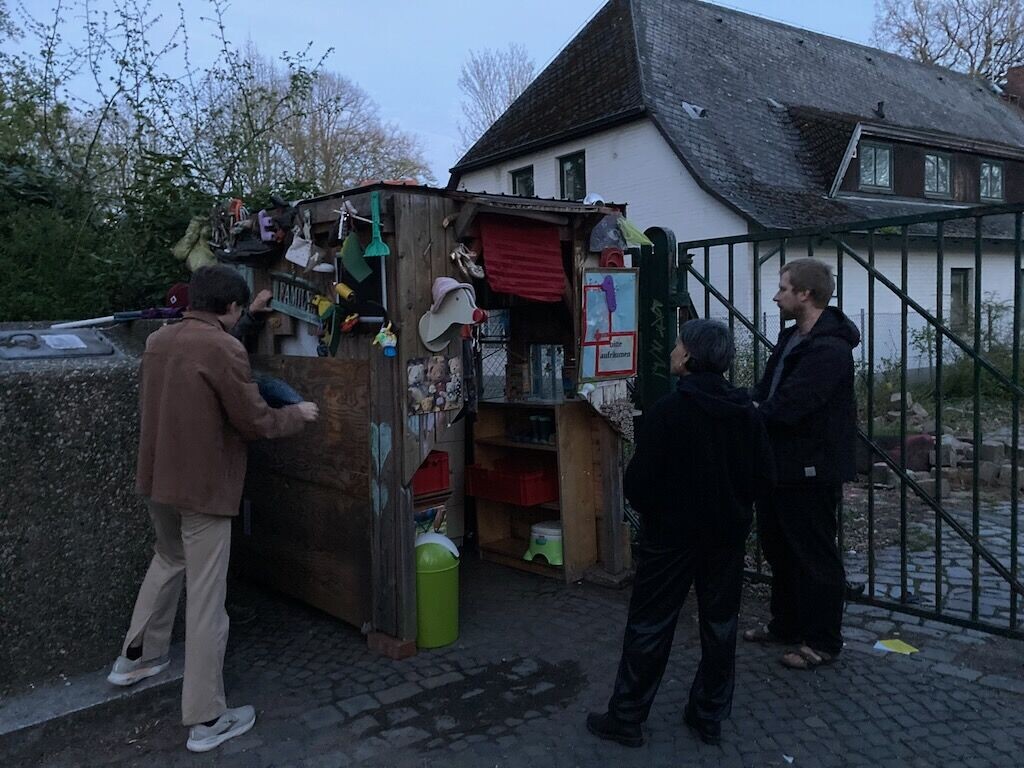 Um 18:00 Uhr am 16. April ging es los, so um die 15 Menschen waren dem Aufruf gefolgt und haben sich an der Fairschenkbox am Haus der Jugend getroffen. Ziel war es, die Box aus dem, wegen der kommenden Bauarbeiten bereits abgesperrten Bereich, ein Stück weiter vor und um die Ecke zu bringen, damit sie endlich wieder fürs öffentlich Tauschen zugänglich ist. Viele hatten schon gefragt, warum das Gelände abgesperrt ist und warum die Box hinter dem großen Tor verschlossen wurde.