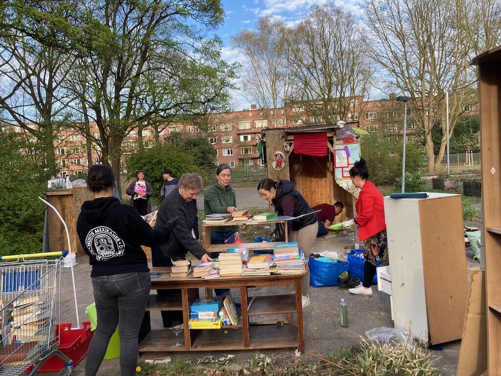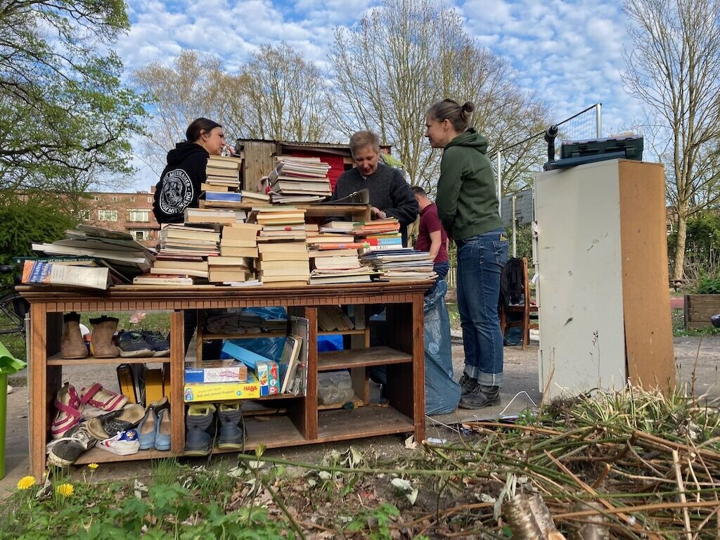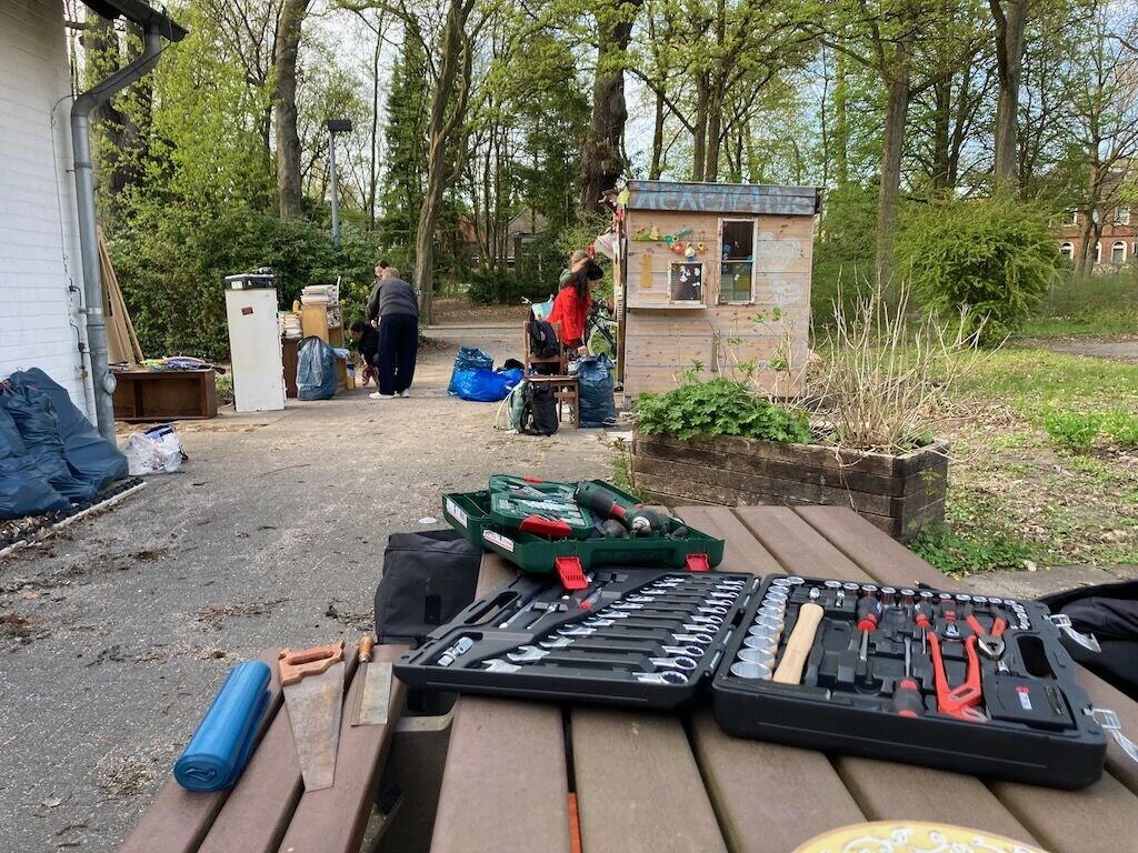 Die Box musste erstmal ausgeräumt werden, damit man dann das komplette Holzgestell von der Verankerung frei sägen und lösen konnte. Alle Tauschsachen wurden inspiziert und neu geordnet und nicht mehr brauchbare und kaputte Sachen in Müllsäcke aussortiert. Der neue Standort wurde zusammen besprochen und schon mal vorbereitet, während auch schon die Schränke, Bücher und Klamotten eine Ecke weiter gebracht wurden. Alle Schränke und Regale wurde bei dieser Gelegenheit auch noch einmal ordentlich geputzt. Die Kleiderstange wurde dann schon mal fertig bestückt, um sie dann quasi komplett am neuen Standort wieder in die Box zu hängen.