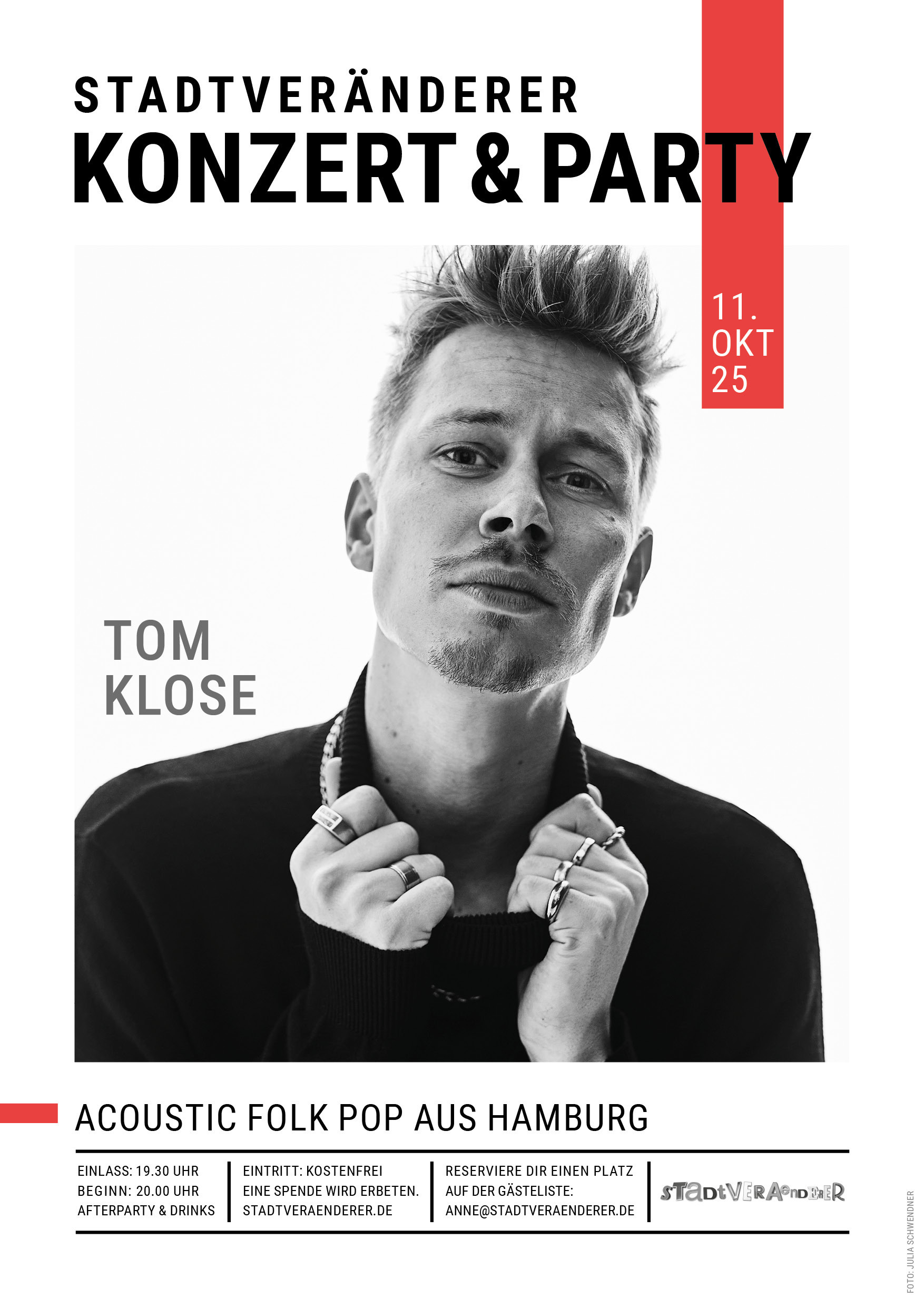 Der Hamburger Künstler Tom Klose bringt Acoustic Folk Pop bei uns auf die Bühne. Tom ist ein Mann der Gegensätze: Stets von seiner treuen Gitarre begleitet, singt er mal mit zarter Kopfstimme, mal mit mächtiger Bruststimme. Dabei präsentiert er sein Herz auf dem Silbertablett, mit einer Garnitur aus tiefer Melancholie und purer Lebensfreude.